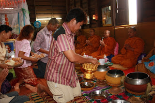 ในช่วงเช้าของวันใหม่จะมีการถวายอาหารและเครื่องไทยทานแด่พระภิกษุสงฆ์ โดยจะนิมนต์มาบ้านเจ้าภาพหรือนำไปถวายที่วัดก็ได้ หลังจากนั้นก็จะมีการถวายผ้าบังสกุล ฟังเทศน์ และกรวดน้ำเพื่ออุทิศส่วนกุศลให้ผู้ที่ล่วงลับไป หลังจากนั้นก็จะมีการจัดเลี้ยงอาหารให้ผู้ที่มาร่วมงาน ก็เป็นอันเสร็จพิธีการทำบุญแจกข้าวแก่ญาติที่เสียชีวิตไป